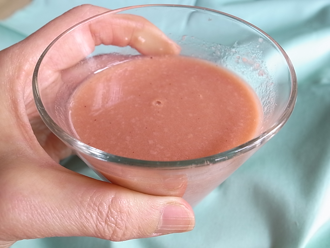 今日のおやつはイチゴ・トマト・甘夏のスムージーです。